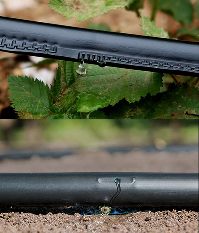 - دارای قطرهچکانهای داخلی: این لولهها قطرهچکانهایی (پلاکها) در فواصل معین دارند که داخل لوله قرار گرفتهاند. این طراحی باعث میشود که آب مستقیماً به ریشه گیاه برسد.